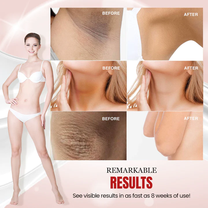 Apto para diferentes tipos de piel: Una crema especialmente creada para ayudar a abordar la apariencia de áreas descoloridas, mejorando el aspecto general de la piel sensible como axilas, zonas íntimas, manos, pecho, rodillas, codos y rostro. Corrige los depósitos de melanina provocados por el bronceado, las hormonas o la depilación.